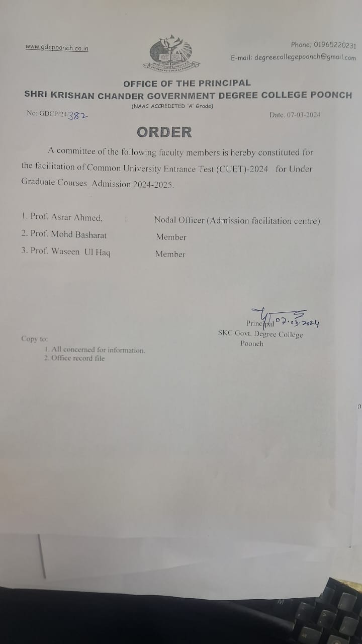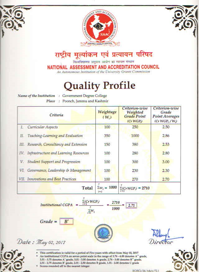 Government Degree College, Poonch was established on 11 th November 1955. The College is presently affiliated to the University of Jammu and is recognized by University Grants Commission (UGC) under section 2(F) &12(B).